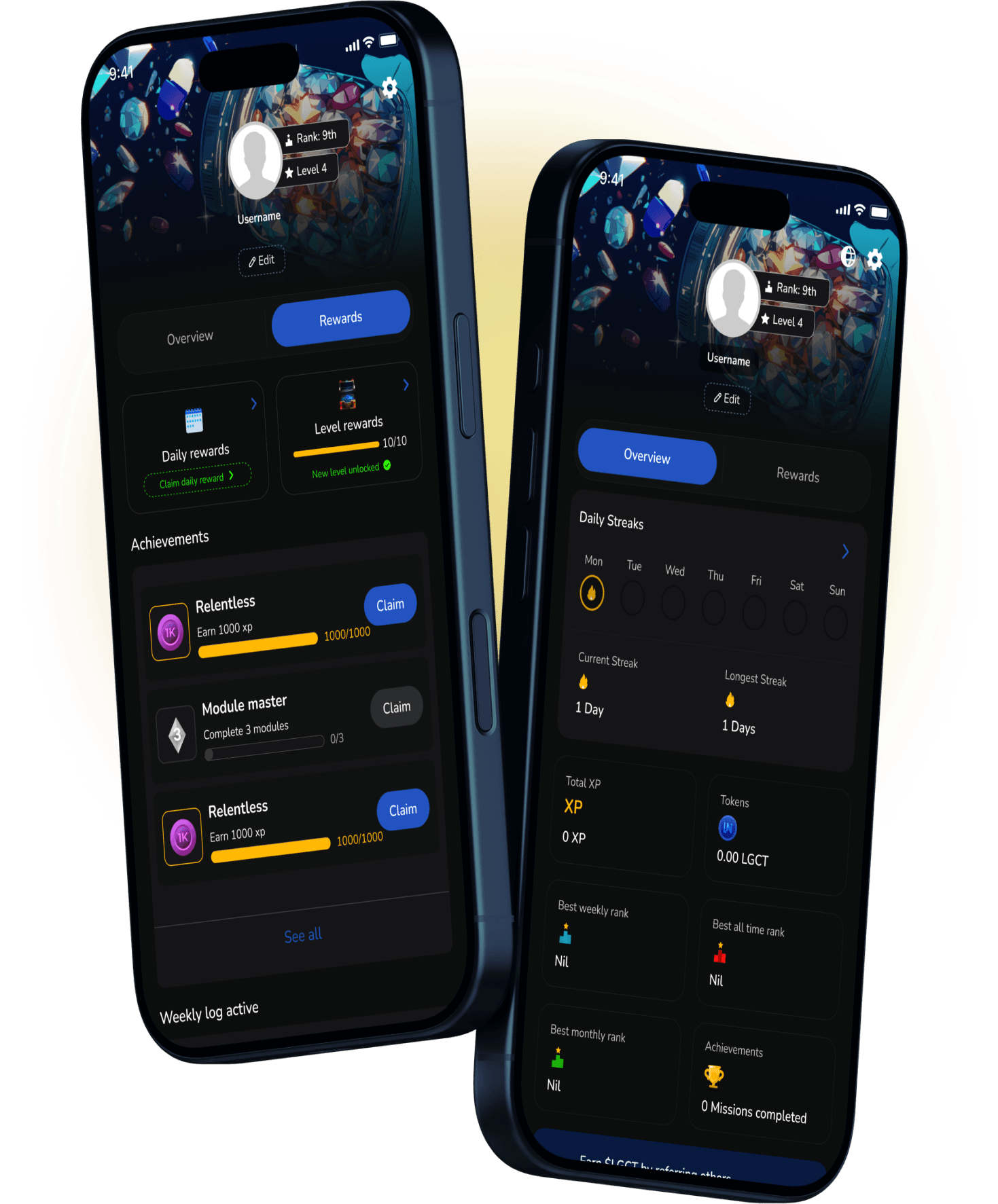A gamified self-improvement app turning personal growth into an interactive adventure. Users complete modules, lessons, and minigames, earning $LGCT rewards. In just three months, the app reached +500,000 downloads with an 4.7-star rating.